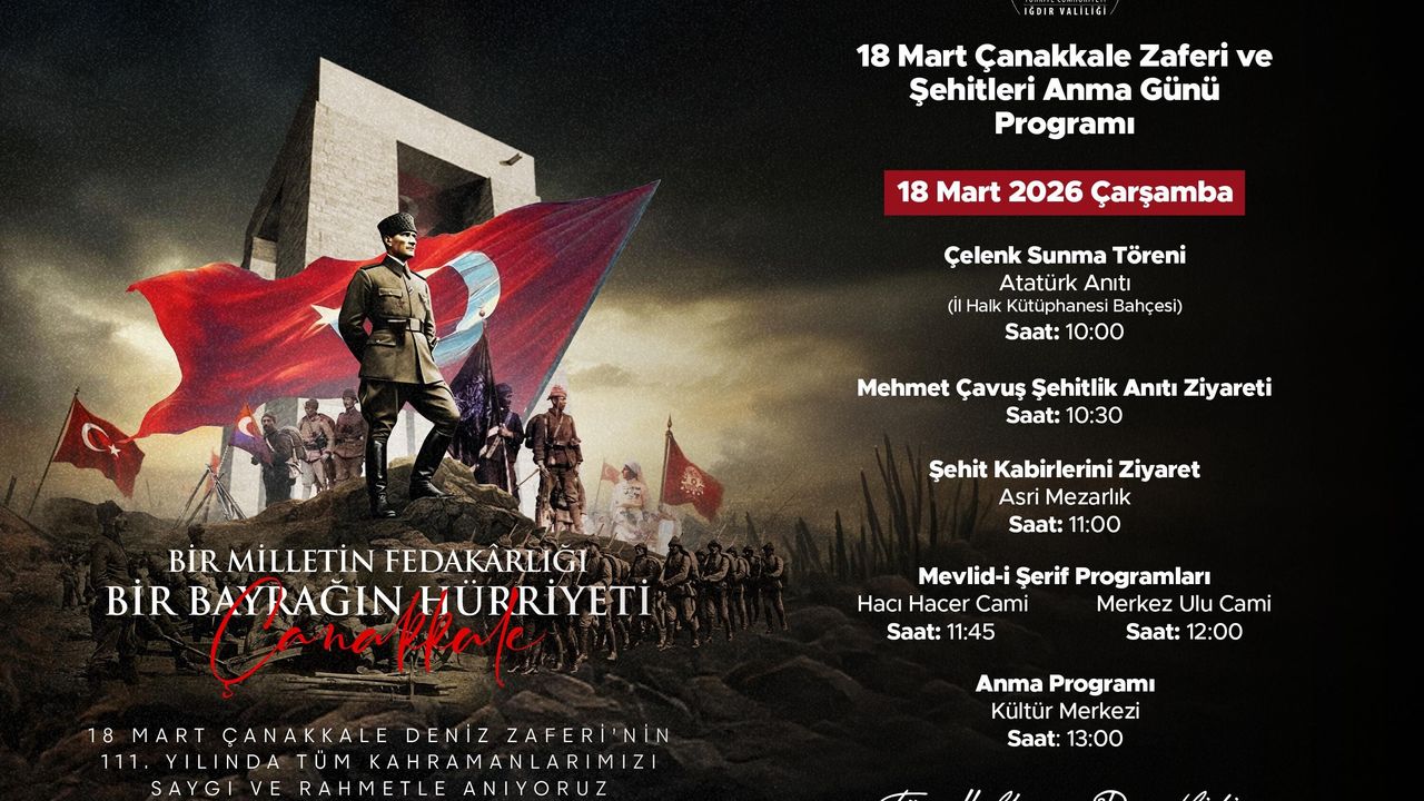 Iğdır Valiliği tarafından organize edilen “18 Mart Çanakkale Zaferi ve Şehitleri Anma Günü” kapsamında gün boyu çeşitli etkinlikler gerçekleştirilecek. Program, sabah saat 10.00’da Atatürk Anıtı’nda düzenlenecek çelenk sunma töreniyle başlayacak. Ardından şehitlik ziyaretleri ve kabir ziyaretleri ile devam edecek anma etkinlikleri, Mevlid-i Şerif programlarıyla sürecek.