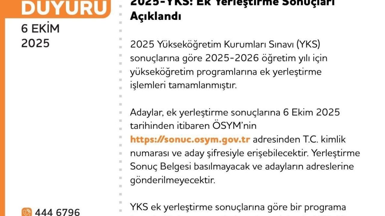 2025 YKS ek yerleştirme sonuçları, Öğrenci Seçme ve Yerleştirme Merkezi (ÖSYM) sitesinde açıklandı. Adayların, ek yerleştirme sonuçlarına 6 Ekim 2025 tarihinde saat 16.30"dan itibaren ÖSYM"nin resmi sitesinden T.C. kimlik numarası ve aday şifresiyle erişebilecekleri belirtildi.