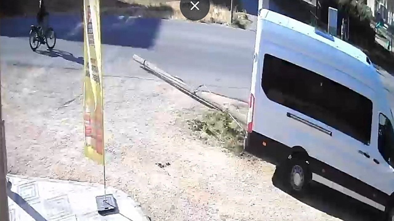 Eskişehir''de bir minibüsün çarptığı 5 metrelik direk yola devrilirken, oradan bisikleti ile geçen bir vatandaş ise direğin altında kalmaktan saniyelerle kurtuldu. Olay anı bir iş yerinin güvenlik kamerasına yansıdı.