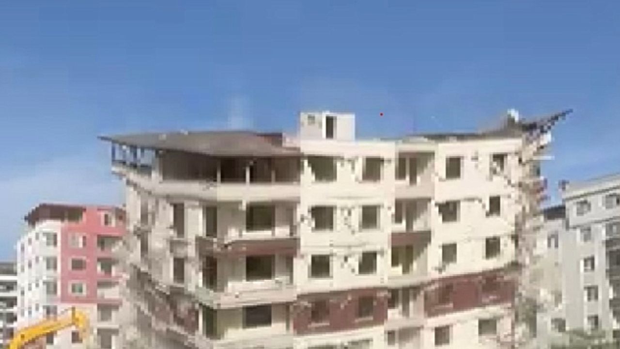 Hatay''ın Defne ilçesinde 7 katlı binanın iş makinesinin darbesiyle kontrollü olarak yerle bir olduğu anlar kameraya yansıdı.