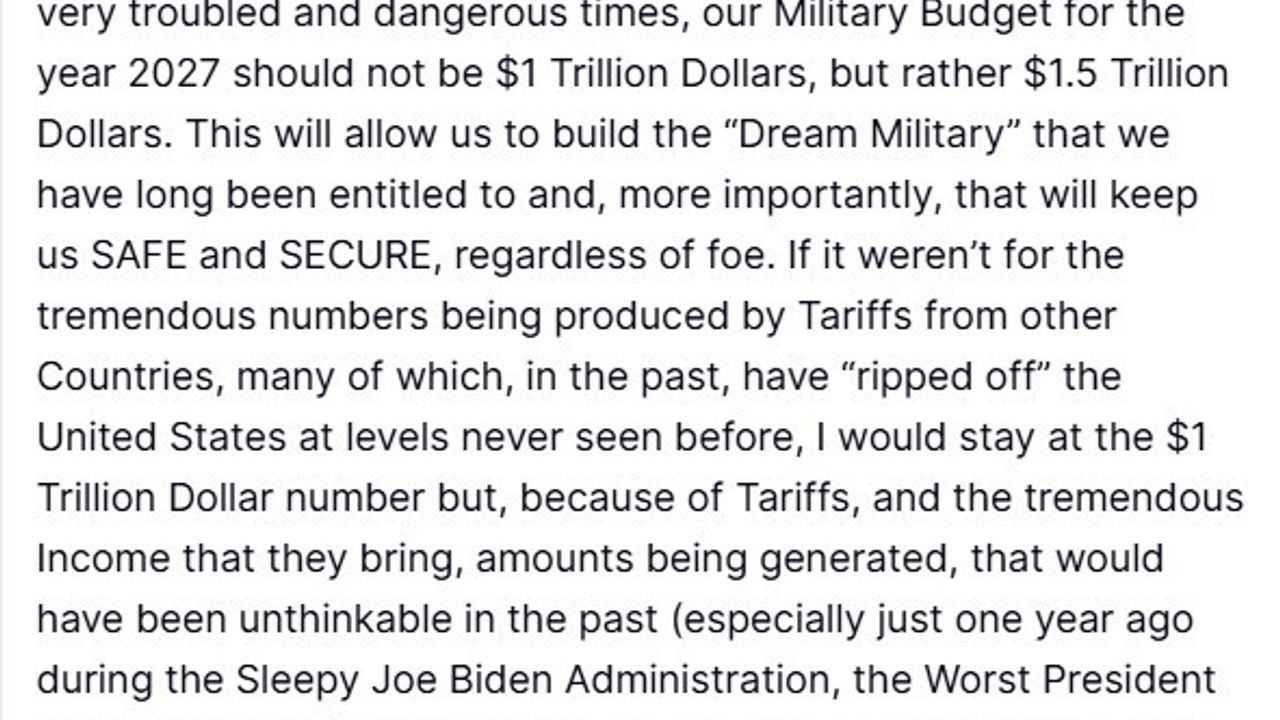 ABD Başkanı Donald Trump, ülkesini çevreleyen zorlu güvenlik ortamına dikkat çekerek, 'Senatörler, Kongre üyeleri, bakanlar ve diğer siyasi temsilcilerle yapılan uzun ve zorlu müzakerelerin ardından, özellikle bu son derece çalkantılı ve tehlikeli dönemde ülkemizin yararı için, 2027 yılı askerî bütçemizin 1 trilyon dolar değil 1 buçuk trilyon dolar olması gerektiğine karar verdim' açıklamasında bulundu.