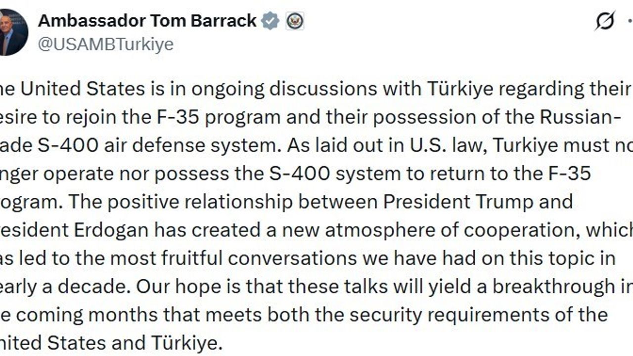 ABD’nin Ankara Büyükelçisi ve Suriye Özel Temsilcisi Tom Barrack, sosyal medya platformu X üzerinden yaptığı paylaşımda, Türkiye’nin F-35 programına geri dönüşü konusunda yürütülen müzakerelere ilişkin açıklamalarda bulundu. Türkiye ile görüşmelerin sürdüğünü ifade eden Barrack, "ABD yasalarına göre, Türkiye’nin F-35 programına geri dönmesi için S-400 sistemlerini kullanmaması ve bulundurmaması gerekiyor" ifadelerini kullandı.