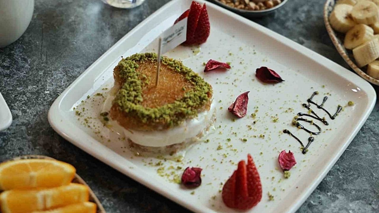 Geyik, gelen çiftlerin masalarına künefeyi kalp şeklinde servis ediyor. Ayrıca kadın tatlıcı, masaları gül yapraklarıyla süsleyip mum koymayı da ihmal etmedi.