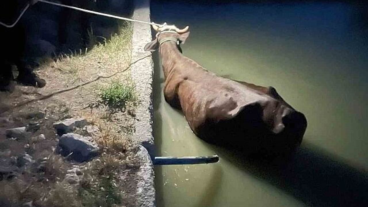 Olay yerine gelen ekiplerin yaklaşık 2 saat süren çalışmalarının ardından inek, iş makinesinin yardımıyla kurtarılarak sahibine teslim edildi.