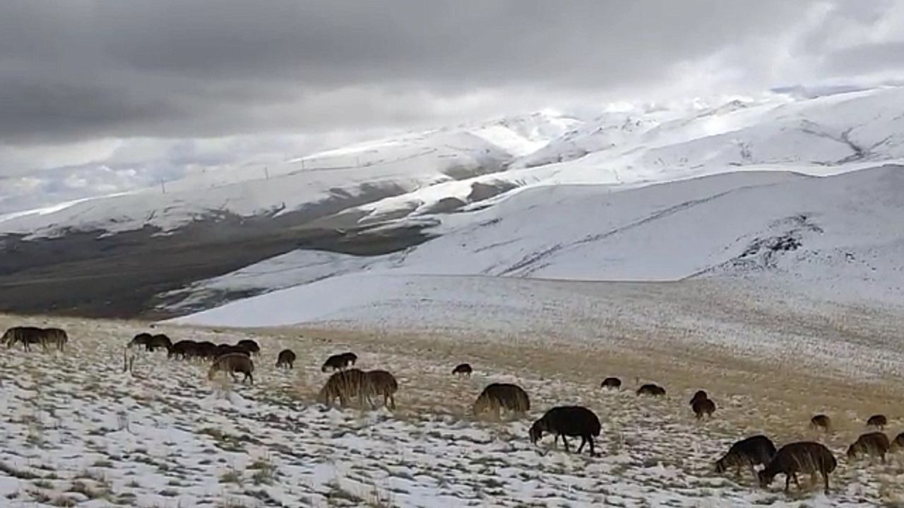 Ağrı''nın yüksek kesimlerinde etkili olan kar yağışına hazırlıksız yakalanan çoban, koyunlarını kar altında otlattı.