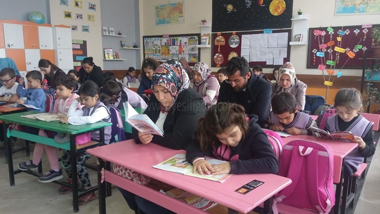 Ailemle okuyorum projesi kapsamında öğrenciler velileriyle okulda sınıfta bir araya gelerek 40 dakika toplu olarak kitap okuma etkinliği yapıyorlar.