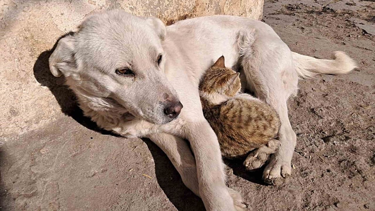 Kars''ın Akyaka ilçesinde insanların içini ısıtan dostluk kameralara yansıdı. Soğuk kış günlerinin hakim olduğu kentte bir kedi ve köpeğin samimi arkadaşlığı görenleri şaşırttı.