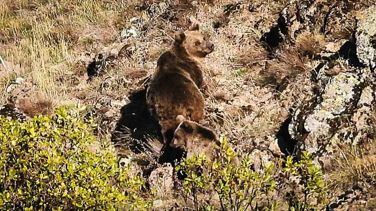Önce anne boz ayı ve bir adet yavrusu yamaç yukarısına koşarak çalıların arasına girdi ve gözden kayboldu. Ardından bir anne boz ayı ve 3 adet yavrusu da yamaçta görüntülendi. Anne ayı ve 3 yavrusu da hızla koşarak çalıların arasına girdi.