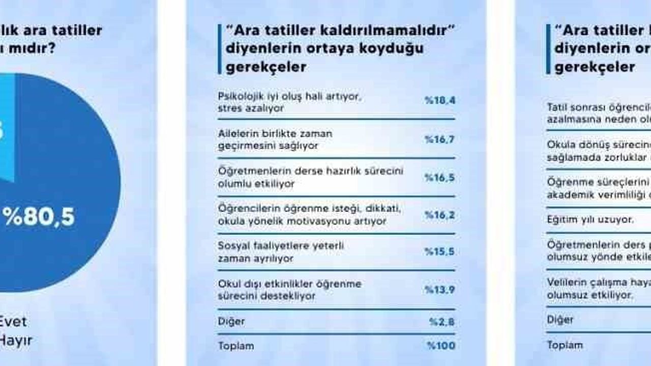 Araştırmada 'Birer haftalık ara tatiller kaldırılmalı mıdır?' sorusuna 'evet' yanıtı veren katılımcıların görüşlerinin gerekçeleri incelendiğinde, katılımcıların en fazla belirttiği nedenler arasında 'tatil sonrası öğrencilerde motivasyonun azalmasına neden oluyor' ve 'okula dönüş sürecinde uyum sağlamada zorluklar oluyor' ifadelerinin öne çıktığı belirtildi. Her iki gerekçe ara tatiller kaldırılmalıdır diyenlerin yüzde 23,4'ünü oluşturduğu açıklandı. Bu durum, ara tatillerin özellikle öğrencilerin psikolojik ve davranışsal uyumu üzerinden eleştirildiğini gösterdiği ifade edildi.