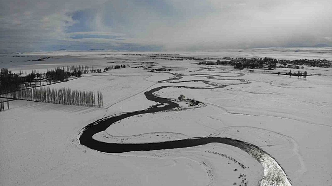 Mendereslerin yılan gibi kıvrımları, beyaz karla birleşerek eşsiz bir görsel şölen oluşturuyor. 4 mevsim bir başka güzelliğe bürünen menderesler havadan görüntülendi.