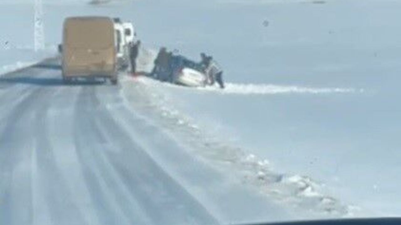 Edinilen bilgilere göre, yoğun kar ve buzlanma nedeniyle kontrolden çıkan araç yol kenarında kara saplandı. Durumu fark eden köylüler hemen harekete geçerek minibüs yardımıyla aracı bulunduğu yerden çekti.