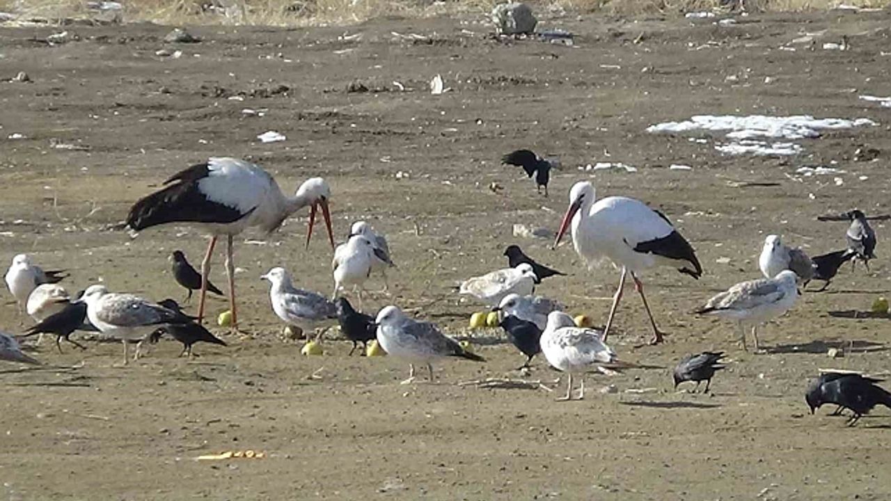 Türkiye''nin en soğuk illeri arasında bulunan ve havaların ısınmasıyla birlikte Van''a gelen leylekler, her yıl olduğu gibi bu kış da sıcak yerlere göç etti. Çoğu leylek, sıcak bölgelere göç ederken Van''ın İpekyolu ilçesindeki 2 leylek ise göç etmeyerek yuvalarında kaldı. Kar yağışı ve dondurucu soğuğa rağmen ilçede kalan leylekler doğadan besleniyor. Van Kalesi''nin güneyini mesken tutan leylekler, burada martılarla birlikte vatandaşların attığı yiyecek ve meyveleri yiyerek yaşam mücadelesi veriyor.