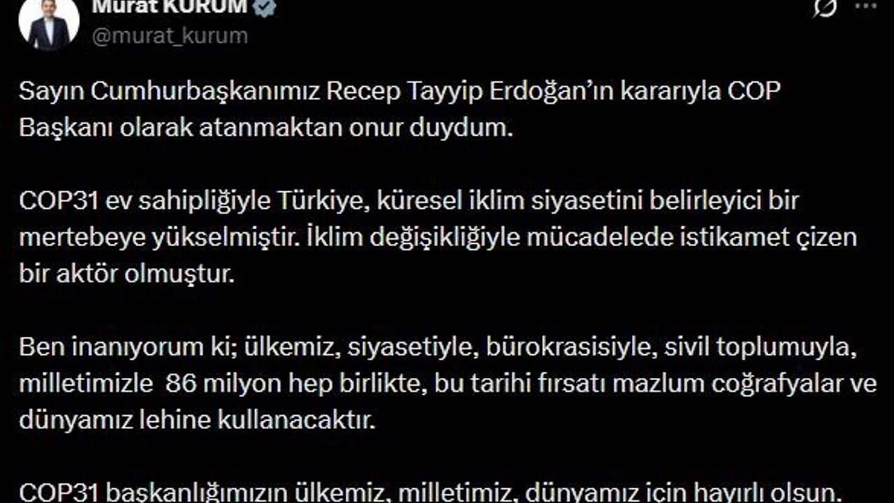 Cumhurbaşkanı Recep Tayyip Erdoğan'ın kararıyla COP Başkanı olarak atanan Çevre, Şehircilik ve İklim Değişikliği Bakanı Murat Kurum, sosyal medya hesabından yaptığı paylaşımda, şu ifadelere yer verdi; 'Cumhurbaşkanımız Recep Tayyip Erdoğan'ın kararıyla COP Başkanı olarak atanmaktan onur duydum. COP31 ev sahipliğiyle Türkiye, küresel iklim siyasetini belirleyici bir mertebeye yükselmiştir. İklim değişikliğiyle mücadelede istikamet çizen bir aktör olmuştur. Ben inanıyorum ki; ülkemiz, siyasetiyle, bürokrasisiyle, sivil toplumuyla, milletimizle 86 milyon hep birlikte, bu tarihi fırsatı mazlum coğrafyalar ve dünyamız lehine kullanacaktır. COP31 başkanlığımızın ülkemiz, milletimiz, dünyamız için hayırlı olsun.'