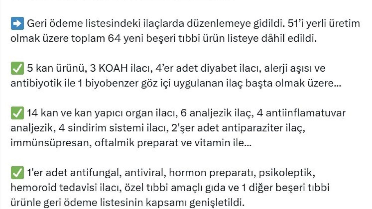 "Önemli bir müjdeyi sizlerle paylaşmak istiyorum. Geri ödeme listesindeki ilaçlarda düzenlemeye gidildi. 51"i yerli üretim olmak üzere toplam 64 yeni beşeri tıbbi ürün listeye dâhil edildi. 5 kan ürünü, 3 KOAH ilacı, 4"er adet diyabet ilacı, alerji aşısı ve antibiyotik ile 1 biyobenzer göz içi uygulanan ilaç başta olmak üzere, 14 kan ve kan yapıcı organ ilacı, 6 analjezik ilaç, 4 antiinflamatuvar analjezik, 4 sindirim sistemi ilacı, 2"şer adet antiparaziter ilaç, immünsüpresan, oftalmik preparat ve vitamin ile 1"er adet antifungal, antiviral, hormon preparatı, psikoleptik, hemoroid tedavisi ilacı, özel tıbbi amaçlı gıda ve 1 diğer beşeri tıbbi ürünle geri ödeme listesinin kapsamı genişletildi. Bu olumlu gelişmenin tüm vatandaşlarımıza hayırlı olmasını diliyorum."