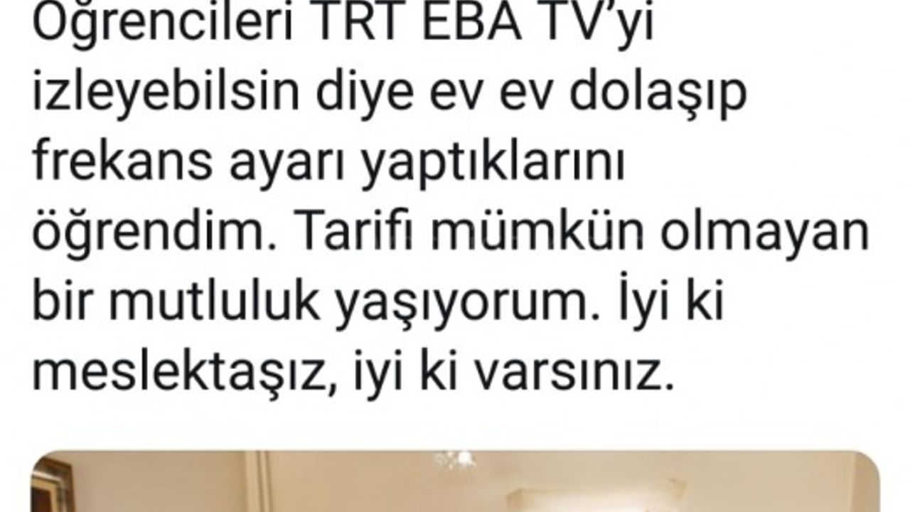 Milli Eğitim Bakanı Ziya Selçuk Twitter hesabından yaptığı paylaşımda şöyle dedi: “Iğdır"da uzaktan eğitim için yollara düşen öğretmenlerime sevgi ve selamlarımı gönderiyorum. Öğrenciler TRT EBA TV"yi izleyebilsin diye ev ev dolaşıp frekans ayarı yaptıklarını öğrendim. Tarifi mümkün olmayan bir mutluluk yaşıyorum. İyi ki meslektaşız, iyi ki varsınız” dedi.