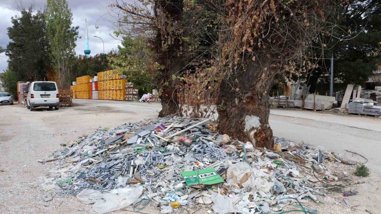 Eskişehir’de yer alan Baksan Sanayi Sitesi’nde mermercilerin yoğun olduğu bölgede bir ağacın dibi sanayi çöpüyle doldu.