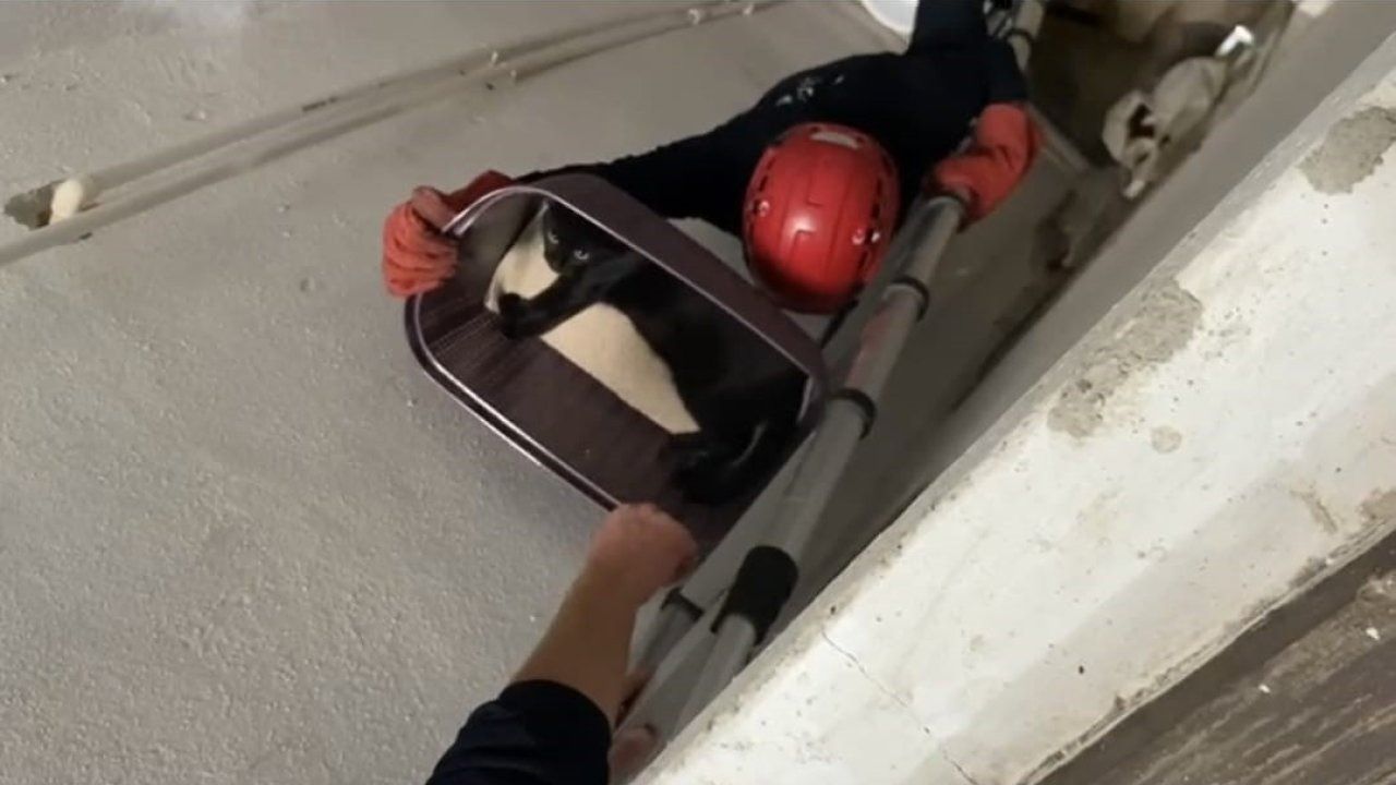 Balıkesir"de beşinci kattan havalandırma boşluğuna düşen kediyi itfaiye ekipleri uzun süren çalışma sonrası kurtarıldı.