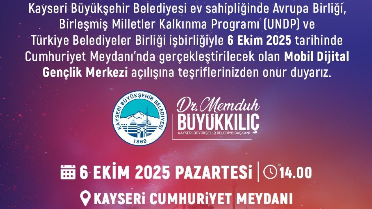 Kayseri Büyükşehir Belediye Başkanı Dr. Memduh Büyükkılıç; "Avrupa Birliği desteğiyle hayata geçirilen ve bilimle teknolojiyi gençlerimizin ayağına götürecek olan Mobil Dijital Gençlik Merkezimizin açılışını, 6 Ekim Pazartesi günü Cumhuriyet Meydanı"nda gerçekleştiriyoruz. Tüm hemşehrilerimizi bu gurur verici güne ortak olmaya davet ediyorum" dedi.