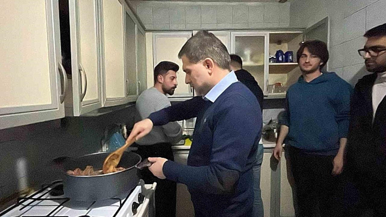 Erzurum''un merkezi ilçesi olan Yakutiye Belediye Başkanı Dr. Mahmut Uçar bu Ramazan''da da geleneği bozmadı ve Ramazanın ilk iftarını üniversite öğrencileriyle birlikte açtı. Yumurtalı kıymalı pide yaptırarak üniversiteleri gençlerin öğrenci evine konuk olan Uçar, elleriyle yaptığı kıymayla da gençlerden tam not aldı. Zaman zaman esprili anların yaşandığı iftar buluşmasında gençlerin hatıralarını da dinleyen ve kendi öğrencilik döneminden hatırlarını anlatarak tecrübelerini paylaşan Başkan Uçar, kayınvalidesinin yaptığı Erzurum''a özgü ayran aşı çorbasını gençlere tattırarak, keyifli anlar yaşattı.