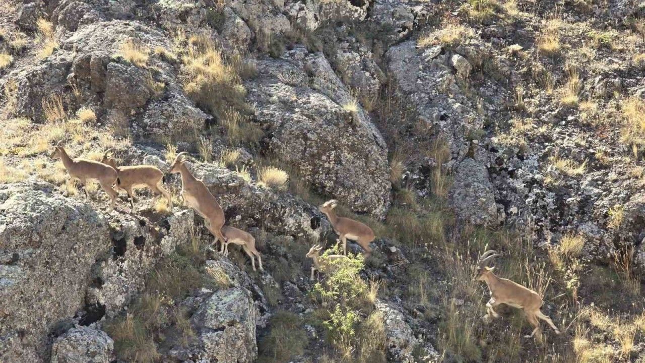 Aracıyla Vauk Dağı güzergahında seyir halindeyken sürüyü fark eden Yüksel Karaaslan, o anları cep telefonuyla kaydetti. Görüntülerde, aralarında yavruların da bulunduğu dağ keçilerinin dağ yamaçlarında rahatça dolaştığı görülüyor.