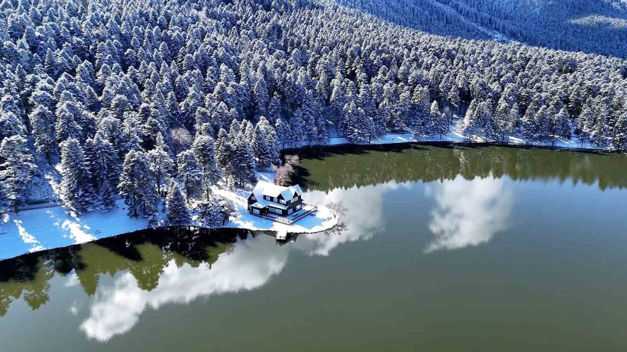 Bolu'nun doğa harikası Gölcük Tabiat Parkı, kar yağışının ardından beyaz gelinliğini giydi. Beyaz örtüyle kaplanan ormanlık alanda oluşan kış manzarası, havadan görüntülendi.