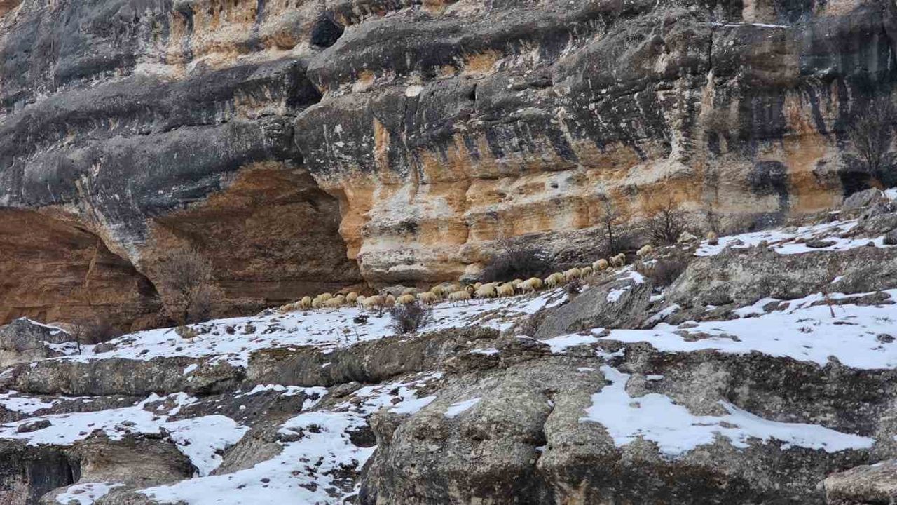 Malatya'da etkili olan yoğun kar yağışı kırsal bölgelerde hayatı olumsuz etkilemeye devam ediyor. Akçadağ ilçesine bağlı Küçükkürne Mahallesi'nde yetiştiricilik yapan bazı üreticiler, hayvanlarını yemlemek için bin 600 rakımdaki kayalık alanlara çıkarmak zorunda kalıyor. Kentte yoğun kar yağışına rağmen ahırlardan çıkarılan sürüler, zorlu arazi şartlarında yemleniyor. Karla kaplı yüksek kayalıklara götürülen hayvanların yolculuğu cep telefonu kamerasıyla görüntülendi.