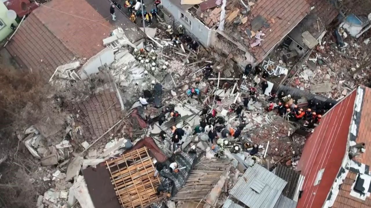 Fatih'te bilinmeyen bir nedenle bitişik halde bulunan 2 gece kondu çöktü. Göçük altında mahsur kalanları kurtarma çalışması havadan görüntülendi.