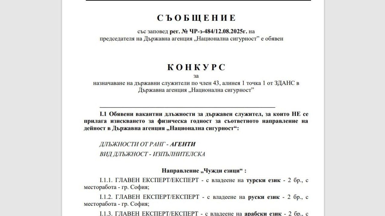 Bulgaristan"ın iç istihbarat ve karşı istihbarattan sorumlu kurumu olan Devlet Ulusal Güvenlik Ajansı (DANS), yeni ajan alımı için yayınladığı ilanda, özellikle Türkçe, Farsça ve Arapça bilen adayların tercih edileceğini belirtti.