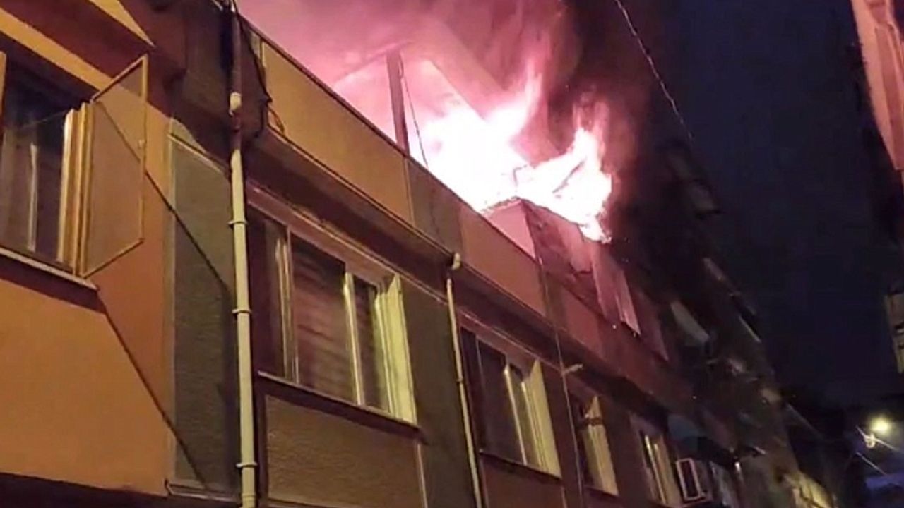 Bursa''da 3 katlı binanın çatı katında çıkan yangın, itfaiye ekiplerinin müdahalesiyle söndürüldü. Yangına müdahale etmeye çalışan ekiplerin üstüne sokak üzerinden geçen elektrik hattı düştü. Korku dolu anlar saniye saniye kameraya yansıdı.