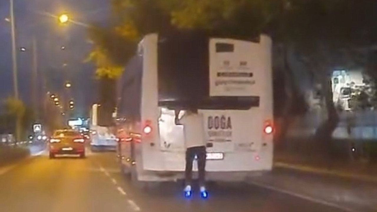 Çanakkale''de bir özel halk otobüsünün arkasına tutunan patenli genç, can güvenliğini tehlikeye atarak yolculuk yaptı. Gencin tehlikeli yolculuğu, cep telefonu kamerasına yansıdı.