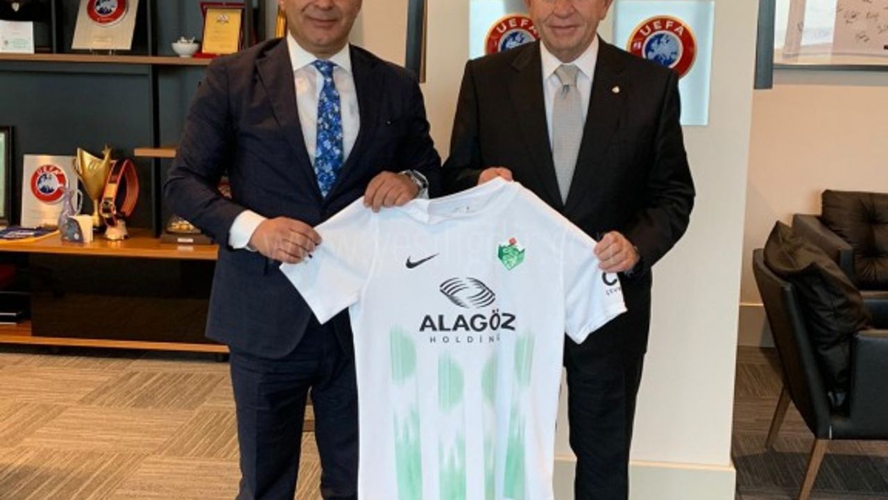 Başkan Cantürk Alagöz, Türkiye Futbol Federasyonu Başkanı Nihat Özdemir"e isminin yazılı olduğu Alagöz Holding Iğdırspor FK forması hediye etti.