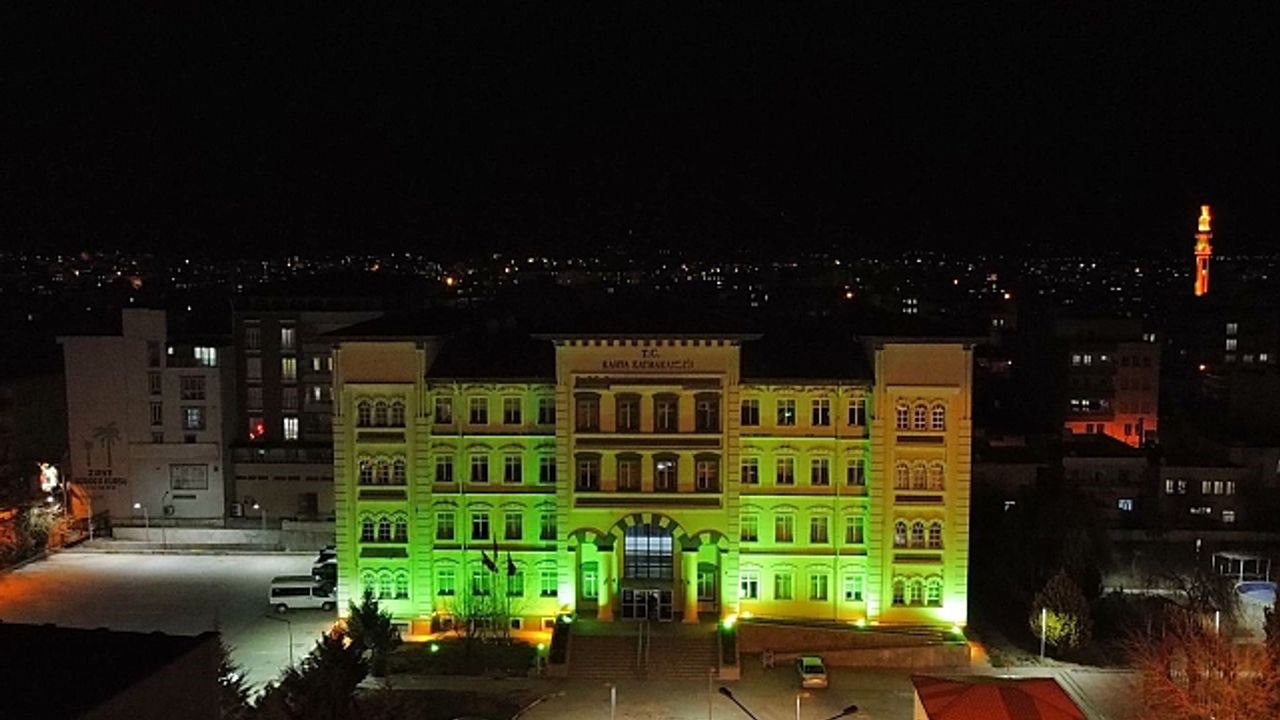 Kahta''da uyuşturucu ile mücadeleye dikkat çekmek için yeşile bürünen antik Roma döneminin en büyük eserlerinden 1850 yıllık Cendere Köprüsü''nden sonra Kahta Kaymakamlık binası da yeşile büründü.