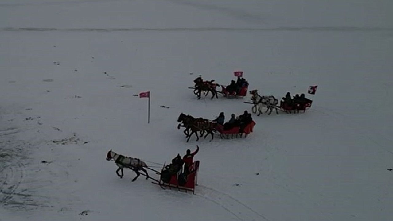 Dondurucu soğuk nedeniyle yüzeyi tamamen buzla kaplanan Çıldır Gölü''ne gelen turistler atlı kızakla geziyor.