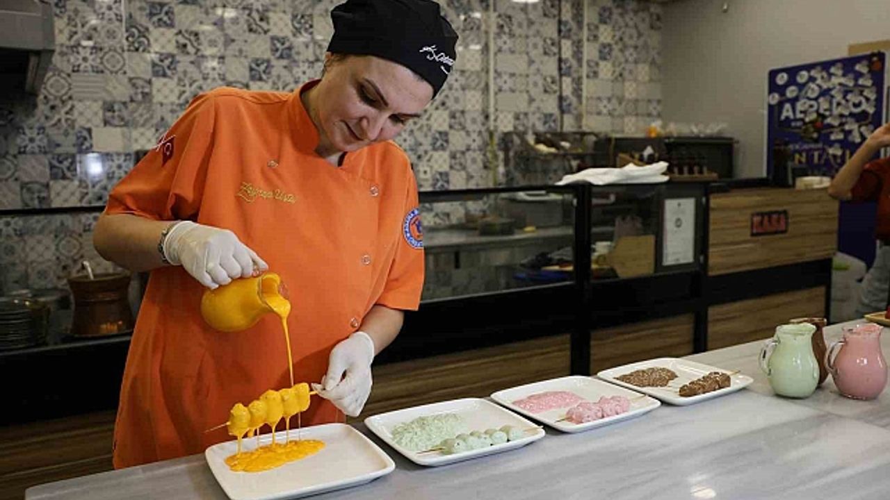 Rengarenk çikolatalar ile servis edilen çöp şiş katmer, yoğun talep görüyor.