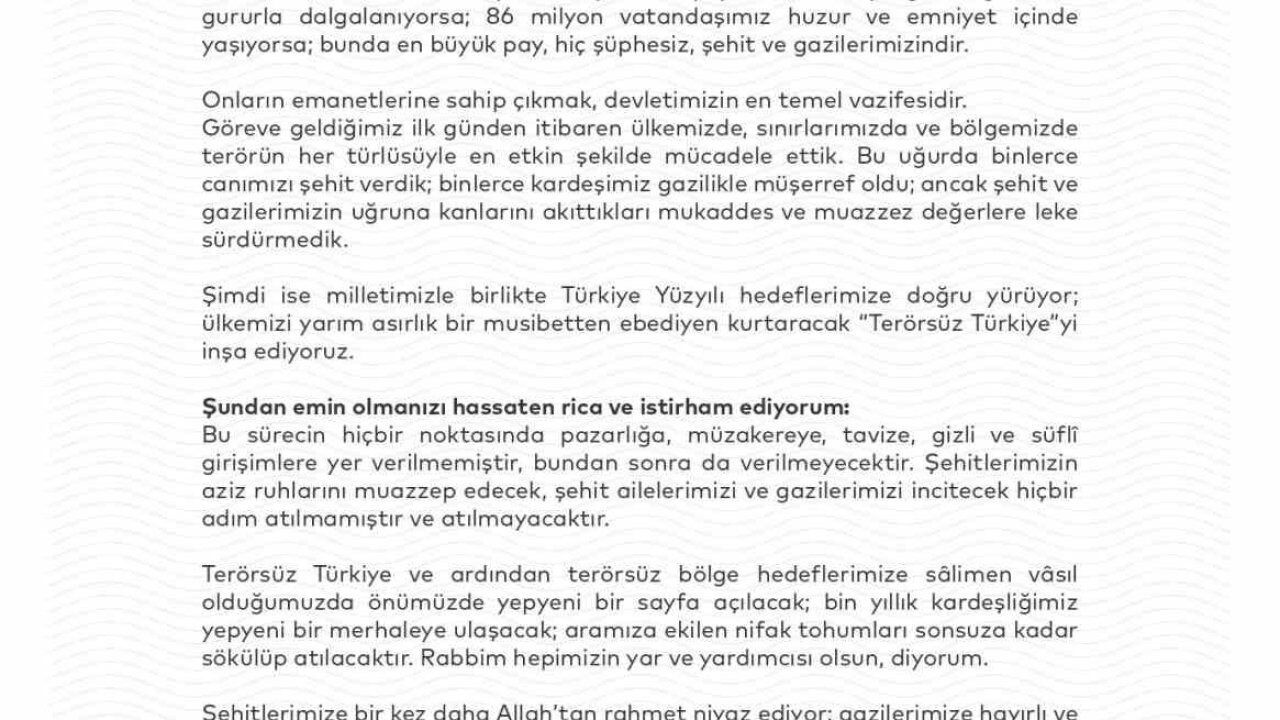 "Sizi ve ailenizin her bir ferdini en kalbî duygularımla selamlıyorum. Peygamberlikten sonraki en şerefli makama erişen aziz şehitlerimizi rahmetle, gazilerimizi şükranla yâd ediyorum. Şühedâ yurdu bu toprakların her karışı, şehit ve gazilerimizin kanlarıyla yoğrulmuştur. Bugün semalarımızda Ezân-ı Muhammedîler huşû ile yankılanıyorsa; ay yıldızlı al bayrağımız göklerde gururla dalgalanıyorsa; 86 milyon vatandaşımız huzur ve emniyet içinde yaşıyorsa; bunda en büyük pay, hiç şüphesiz, şehit ve gazilerimizindir. Onların emanetlerine sahip çıkmak, devletimizin en temel vazifesidir. Göreve geldiğimiz ilk günden itibaren ülkemizde, sınırlarımızda ve bölgemizde terörün her türlüsüyle en etkin şekilde mücadele ettik. Bu uğurda binlerce canımızı şehit verdik; binlerce kardeşimiz gazilikle müşerref oldu; ancak şehit ve gazilerimizin uğruna kanlarını akıttıkları mukaddes ve muazzez değerlere leke sürdürmedik. Şimdi ise milletimizle birlikte Türkiye Yüzyılı hedeflerimize doğru yürüyor; ülkemizi yarım asırlık bir musibetten ebediyen kurtaracak Terörsüz Türkiye"yi inşa ediyoruz. Şundan emin olmanızı hassaten rica ve istirham ediyorum: Bu sürecin hiçbir noktasında pazarlığa, müzakereye, tavize, gizli ve süflî girişimlere yer verilmemiştir, bundan sonra da verilmeyecektir. Şehitlerimizin aziz ruhlarını muazzep edecek, şehit ailelerimizi ve gazilerimizi incitecek hiçbir adım atılmamıştır ve atılmayacaktır. Terörsüz Türkiye ve ardından terörsüz bölge hedeflerimize sâlimen vâsıl olduğumuzda önümüzde yepyeni bir sayfa açılacak; bin yıllık kardeşliğimiz yepyeni bir merhaleye ulaşacak; aramıza ekilen nifak tohumları sonsuza kadar sökülüp atılacaktır. Rabbim hepimizin yar ve yardımcısı olsun, diyorum. Şehitlerimize bir kez daha Allah"tan rahmet niyaz ediyor; gazilerimize hayırlı ve bereketli ömürler diliyorum. Şehit ve gazilerimizi yetiştiren anne ve babalarımızın o mübarek ellerinden; şehitlerimizin emaneti olan sevgili evlatlarımızın gözlerinden öpüyorum. Sizleri sevgiyle, saygıyla selamlıyorum."