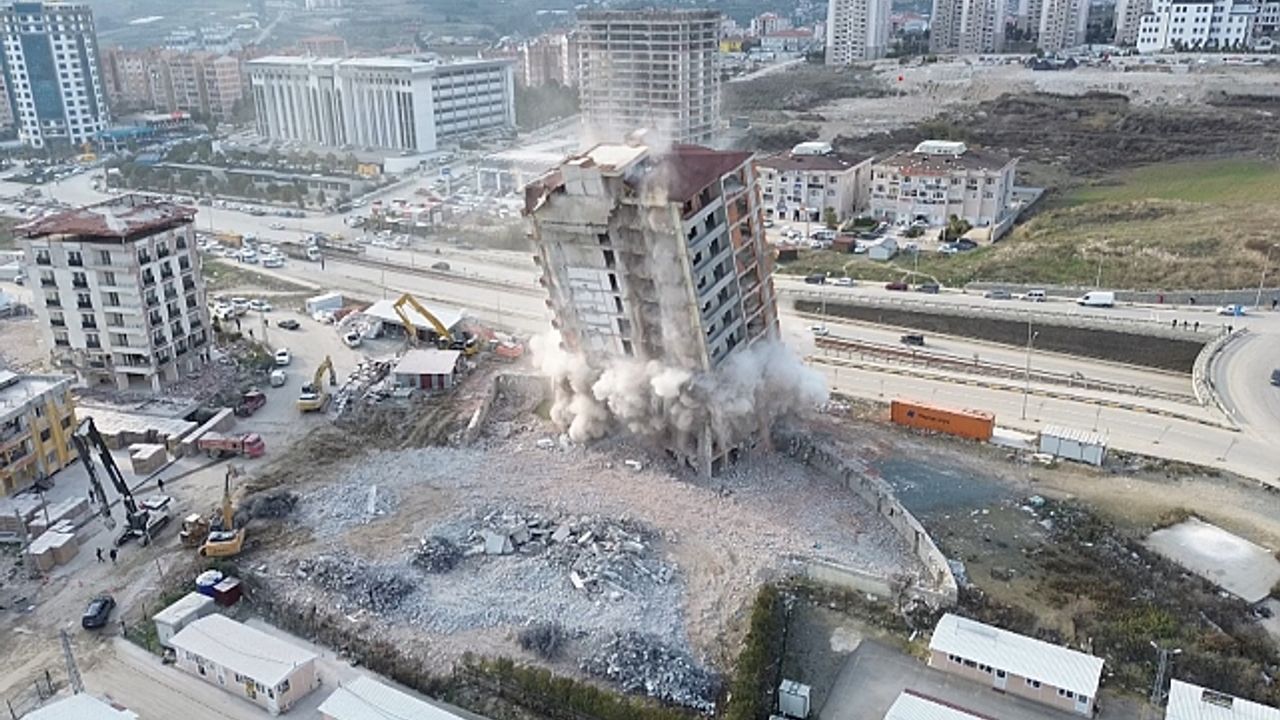 Kahramanmaraş merkezli depremlerde ağır hasar alan Hatay''da mahkeme süreci sona eren binaların yıkım ve enkaz kaldırma çalışmaları aralıksız sürüyor. Antakya ilçesi Akasya Mahallesi''nde bulunan 14 katlı bina, iş makinesinin halat yardımıyla kontrollü olarak yıkıldı. 14 katlı binanın yıkımı esnasında herhangi bir olumsuzluk yaşanmazken binanın yıkımı havadan görüntülendi. 14 katlı binanın yıkımını izleyen vatandaşlar, binanın yıkım esnasında deprem etkisi yaşatarak sarsıntı oluşturduğunu söylediler.