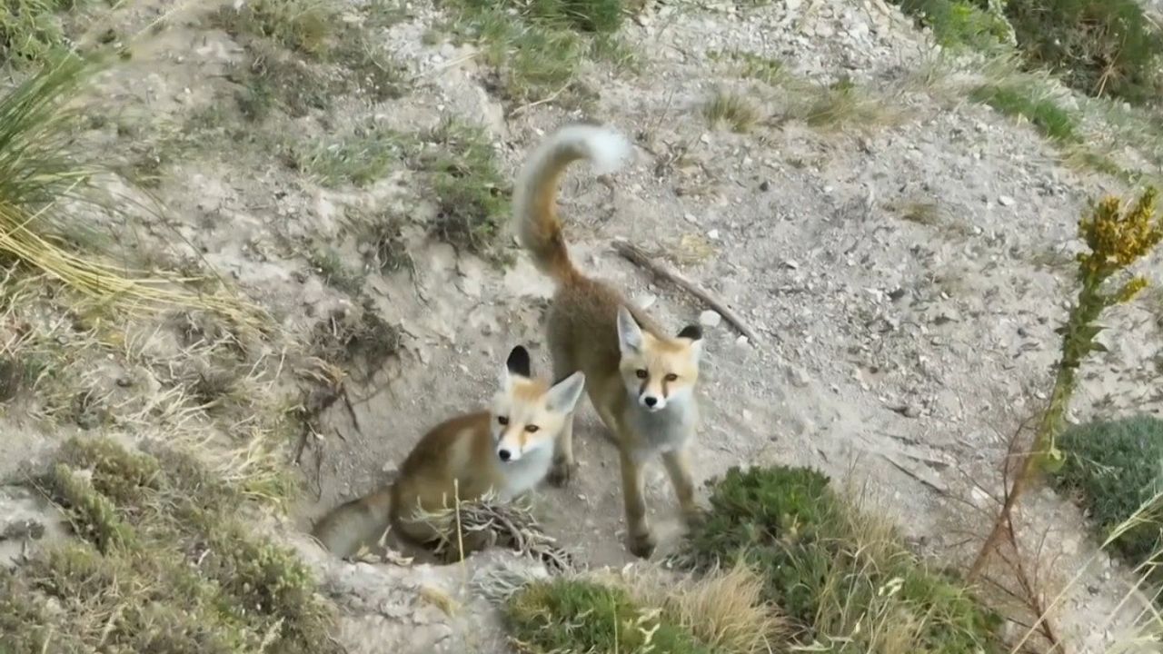 Erzincan’da anne tilki ve iki yavrusu, yuvalarında drone ile görüntülendi.