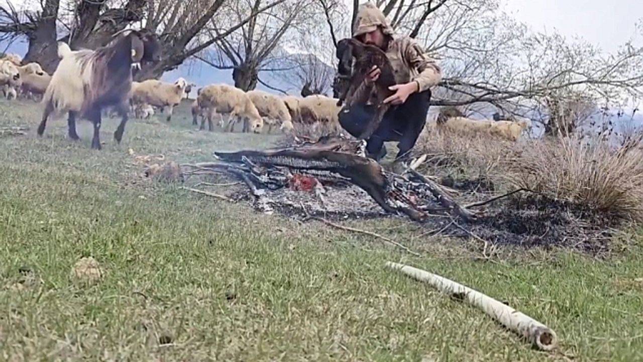 Dolu yağışı sonrası havanın açmasıyla yeni doğan oğlağı fark eden Yılmaz, çevreden topladığı odunlarla ateş yaktı. Üşüyen oğlağın ateşin kenarında ısınmasını sağlayan Yılmaz, bu anları kayda aldı. Oğlak ısınırken anne keçi de yanı başında bekledi. Biraz ısınan oğlak kendine gelerek sürüye karıştı.
