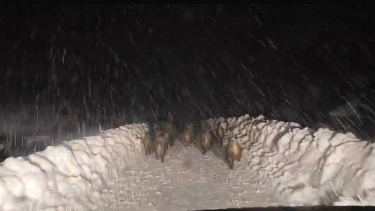 İl Özel İdaresi ekiplerinin Çeltikyolu köyünde karla mücadele çalışmaları sırasında yolda ilerleyen yaban domuzu sürüsü görüldü. O anlar cep telefonu kamerasıyla kaydedildi. Görüntüde, sürücünün karlı yolda koşarak ilerleyen domuzlara 'yol verin' diye seslenmesi de yer aldı.