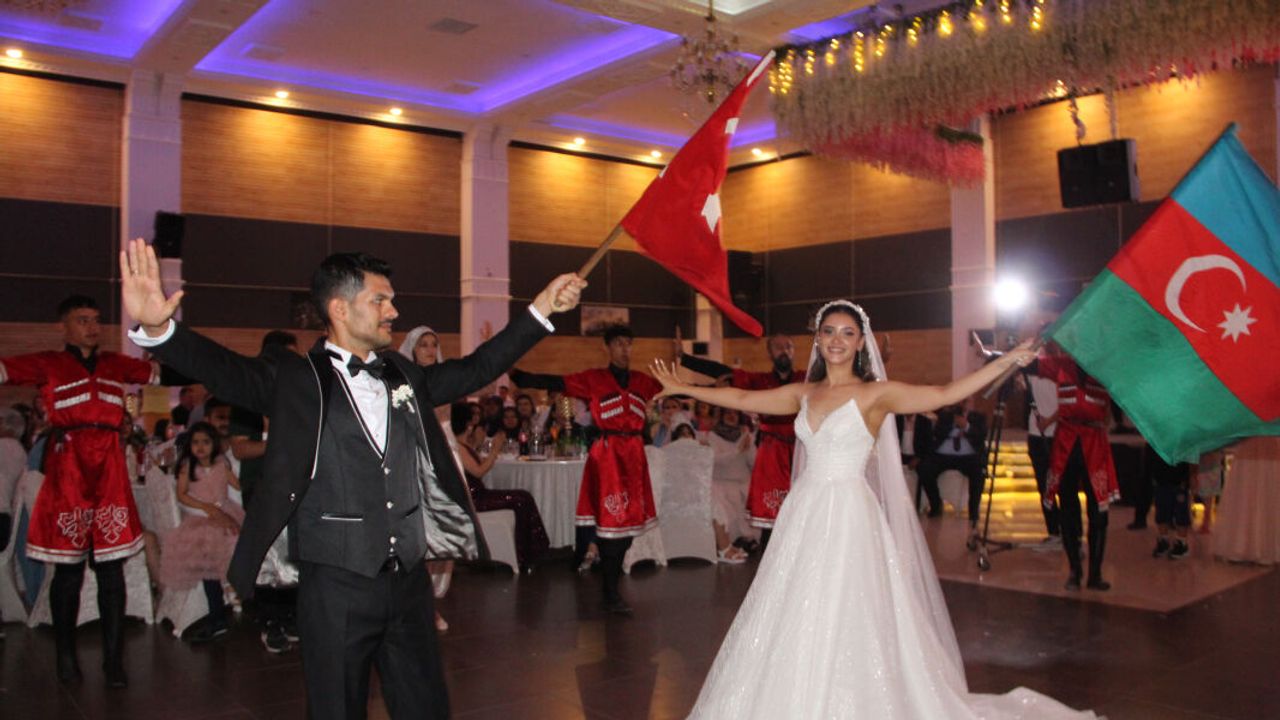 Ali Tuğrul ve Merve çifti, oyunda Azerbaycan ve Türkbayrağını ellerinde dalgalandırarak kafkas dansına eşlik ettiler.