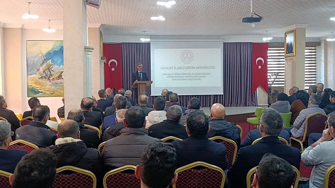 Bayburt İl Milli Eğitim Müdürü Ömer Faruk Kahraman, toplantıda kurum müdürlerine Türkiye Yüzyılı Maarif Modeli, öğrencilerin devam-devamsızlık durumları ve uygulanan projeler gibi konuları aktardı.