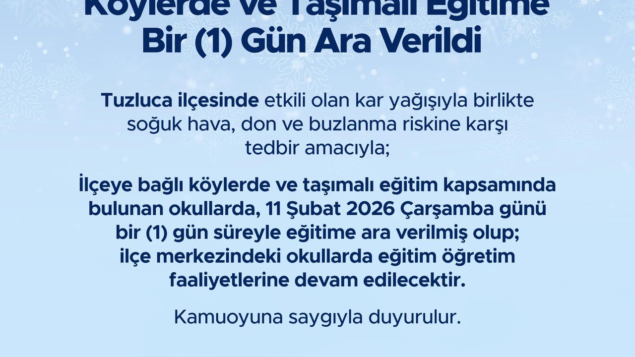 Dün gece saatlerinden itibaren etkisini artıran kar yağışı, soğuk hava, don ve buzlanma riskini de beraberinde getirdi. Iğdır Valiliği’nden yapılan açıklamada, olumsuz hava koşulları nedeniyle Tuzluca ilçesine bağlı köylerde ve taşımalı eğitim kapsamında bulunan okullarda 11 Şubat 2026 Çarşamba günü eğitim-öğretime bir (1) gün süreyle ara verildiği bildirildi.