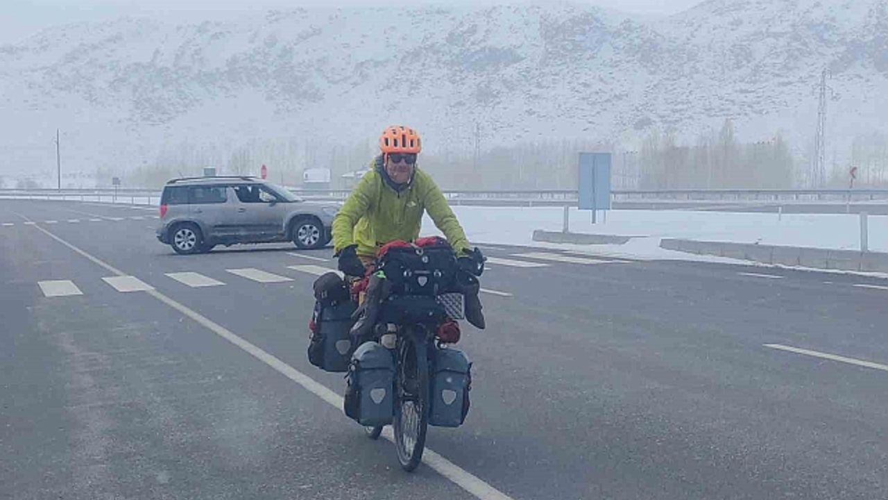 Bisiklet turuna çıkan Fransız David Meignan, Türkiye''ye gelene kadar 7 bin kilometre pedal çevirdi. Ülkesinden 6 ay önce bisikletiyle tura çıkan Fransız Meignan, Fransa, Kuzey İtalya, Slovenya, Hırvatistan, Bosna Hersek, Karadağ, Kosova, Kuzey Makedonya, Kuzey Yunanistan olmak üzere 8 ülkeyi geçtikten sonra Türkiye''ye geldi. Edirne''den Türkiye''ye giriş yaparak sırasıyla İstanbul, Ankara, Kapadokya, Gaziantep, Diyarbakır, Batman, Tatvan ve Van''ın Çaldıran ilçesine ulaşan Meignan, buradan Doğubayazıt, Iğdır ve oradan da Kars üzerinden Gürcistan''a geçecek.