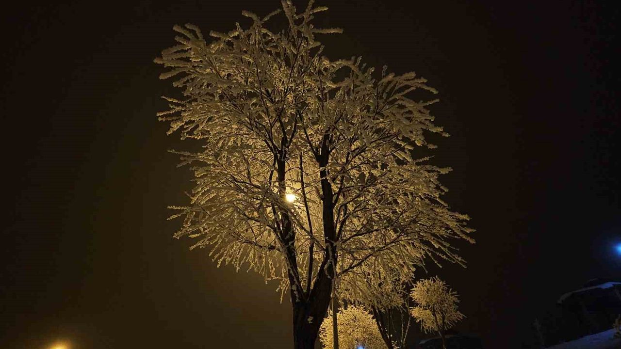 Elazığ'da etkili olan sis ve donla birlikte ağaçlar kırağı tuttu.