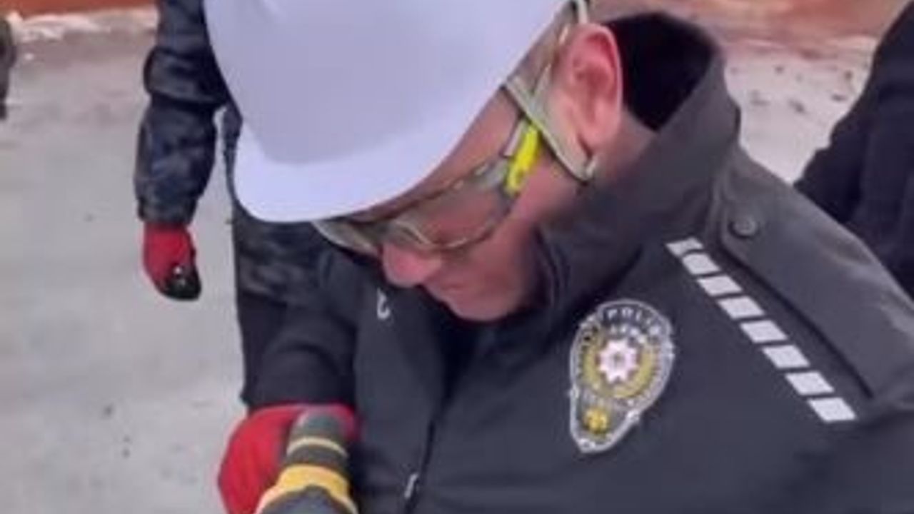 Gönüllü polisler, eğitim alanındaki ağır ekipmanları kaldırıp, tünel işçisi gibi enkaz alanındaki betonları keserek parçalıyor.