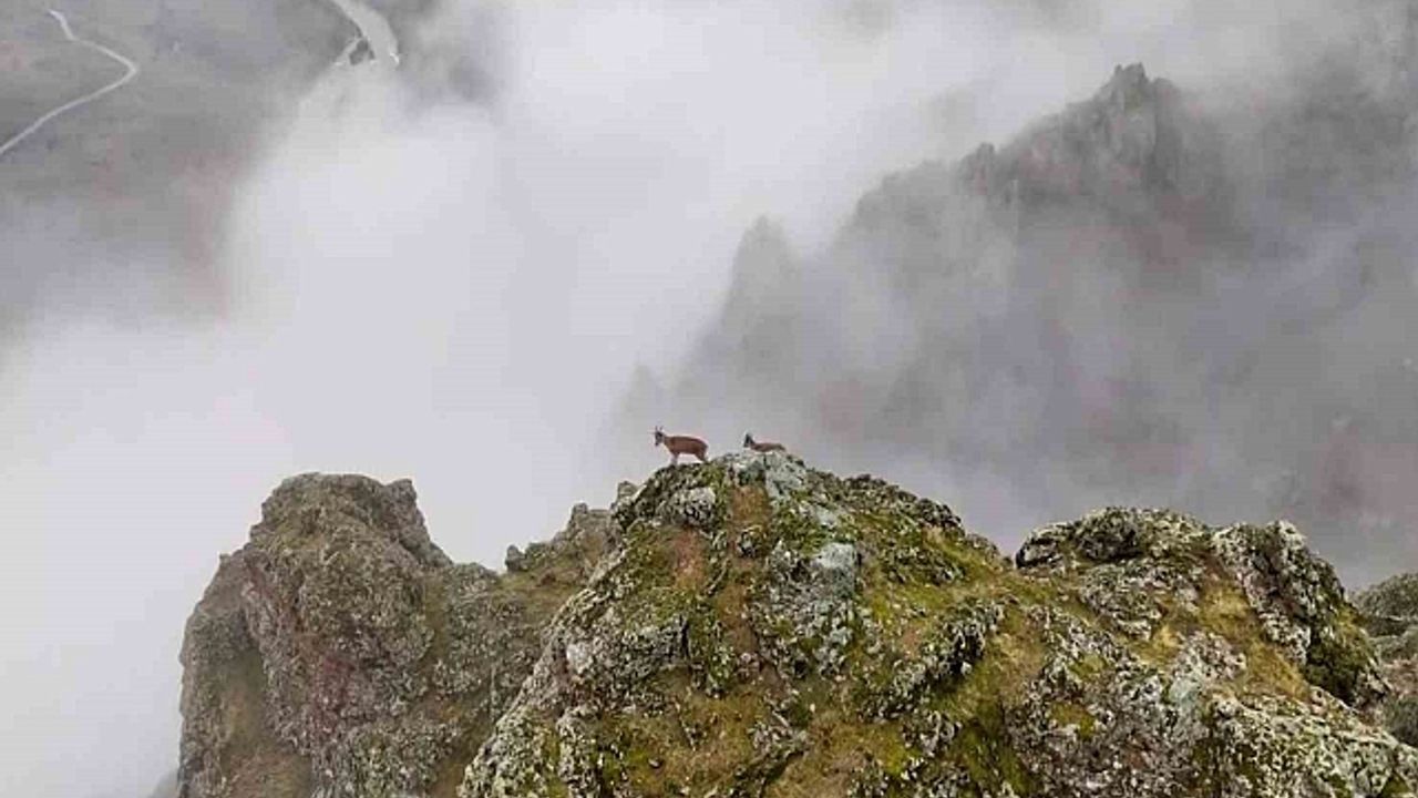 Yaban hayatında zengin bir coğrafyaya sahip Erzincan''da sis bulutlarının arkasındaki yüksek kayalıkları mesken tutan dağ keçilerinin görüntüsü mest etti.