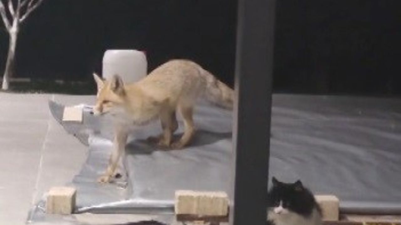 Erzincan’da bir tilki, evin bahçesine girerek kedilerin mamasına yöneldi. Kedilerin saldırısıyla karşılaşan tilki, ev sahibine aldırış etmeden sergilediği rahat tavırla dikkat çekti.