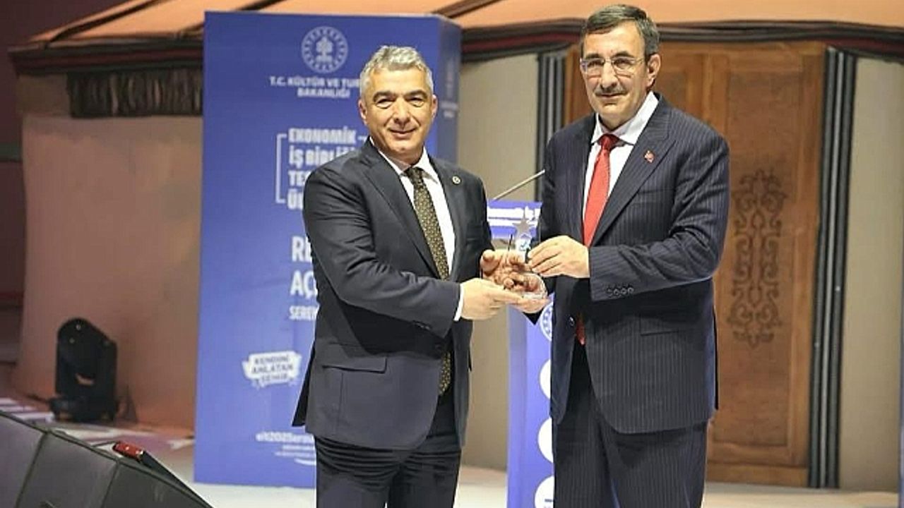 Törende Cumhurbaşkanı Yardımcısı Cevdet Yılmaz, katkılarından dolayı AK Parti Iğdır Milletvekili ve Alagöz Holding Yönetim Kurulu Başkanı Cantürk Alagöz"e plaket takdim etti.