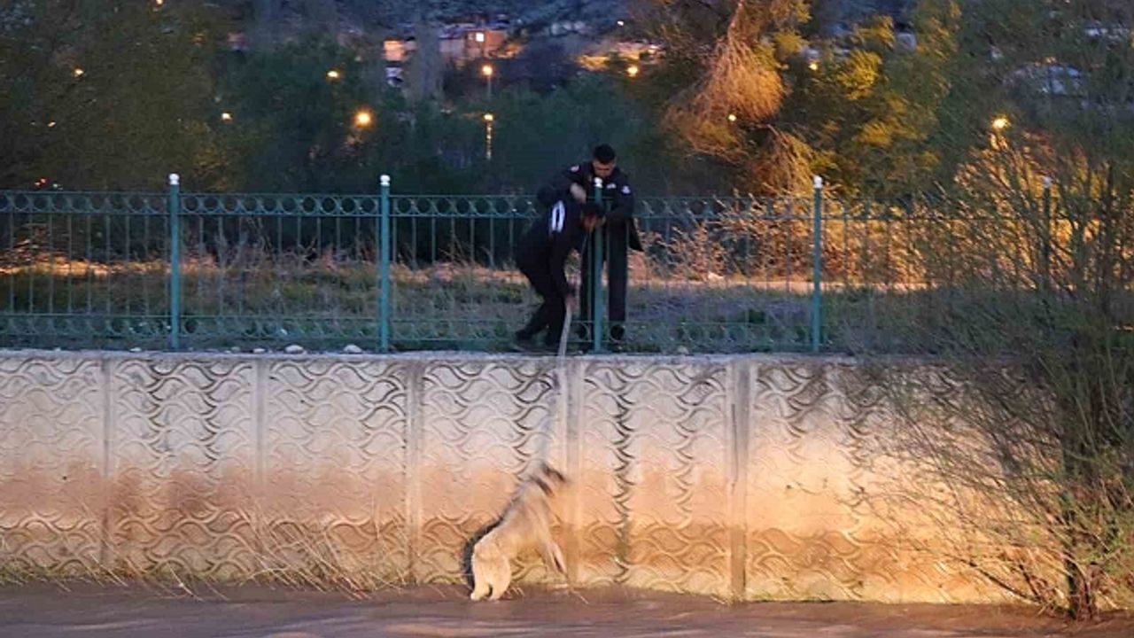 Köpek, Ziyabey Caddesi üzerindeki ikinci köprünün bulunduğu noktada, iş yerlerinin önünde yeniden karaya çıktı. Ekipler, çok acıktığı tahmin edilen köpeğe önce ekmek vererek sakinleşmesini sağladı. Ardından iş yerinin bodrum katına giren ekipler, köpeği sağlıklı bir şekilde yakalayarak kurtardı.
