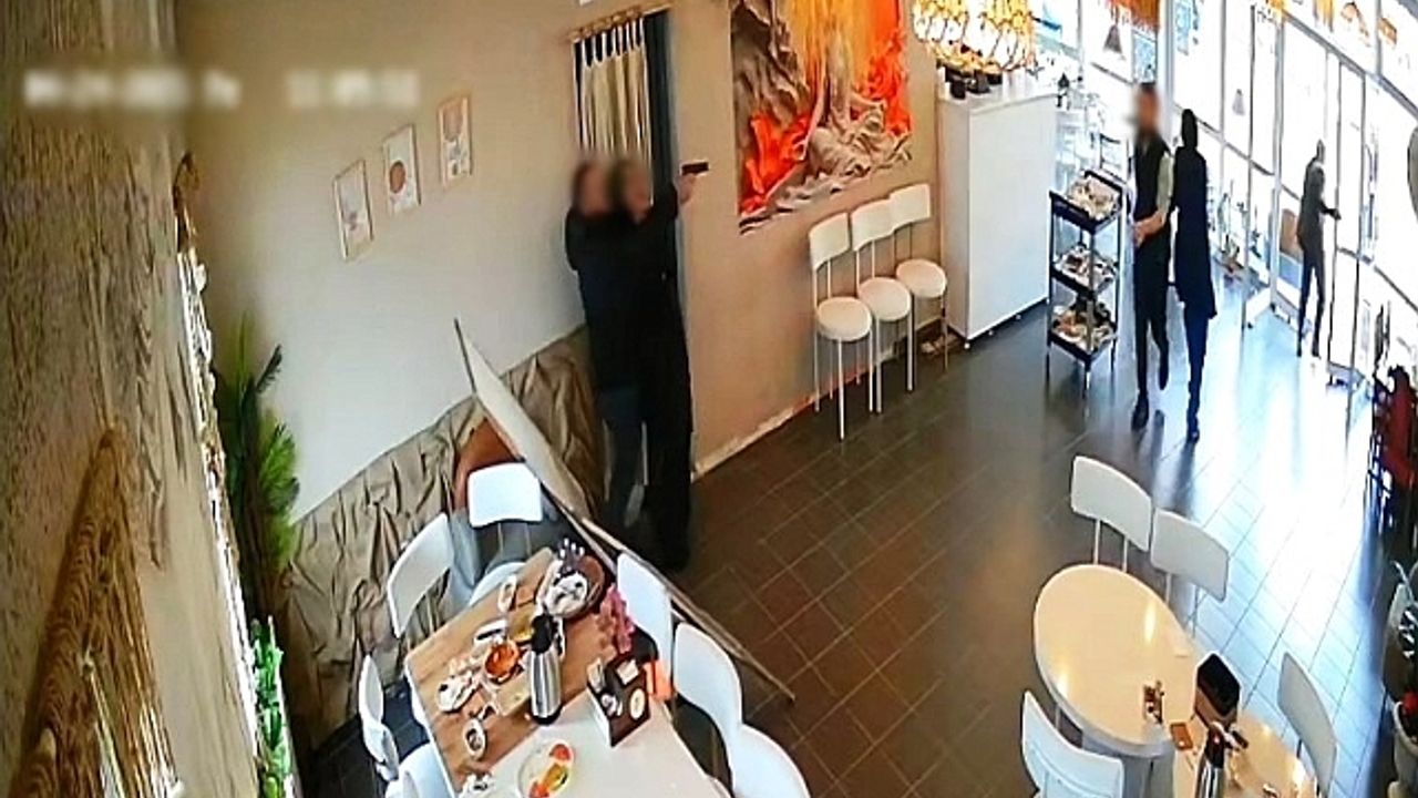 Cinayet ve intihar anı, olay yerindeki güvenlik kamerasına saniye saniye yansıdı. Görüntülerde, Cengiz Altınel''in masayı toplayan eşinin yanına gelerek bir süre konuştuğu, ardından arkasından sol kolunu boynuna dolayarak tabancayı başına dayadığı, çevredeki vatandaşları tehdit ederek bölgeden uzaklaştırdığı, daha sonra eşinin başına bir el ateş ettiği ve ardından aynı silahı kendisine doğrultarak ateşlediği görülüyor.